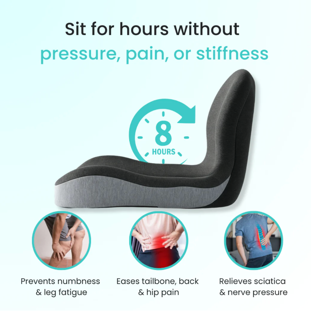 Prolonged sitting causes your spine to collapse and puts pressure on your tailbone and sciatic nerve. Surface cushioning can't fix that.