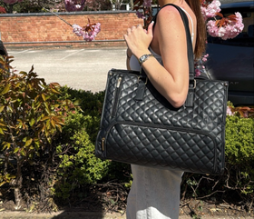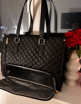 Nicole P. June 2024Verified BuyerThoughtful design in every detailExterior pockets are magnetic snap (faster than zippers). Handles hang perfectly on chairs. Key clip means never digging. Laptop sleeve has false bottom. Wellness zipper has large pull tab for gloves. Solves problems before you notice them.
